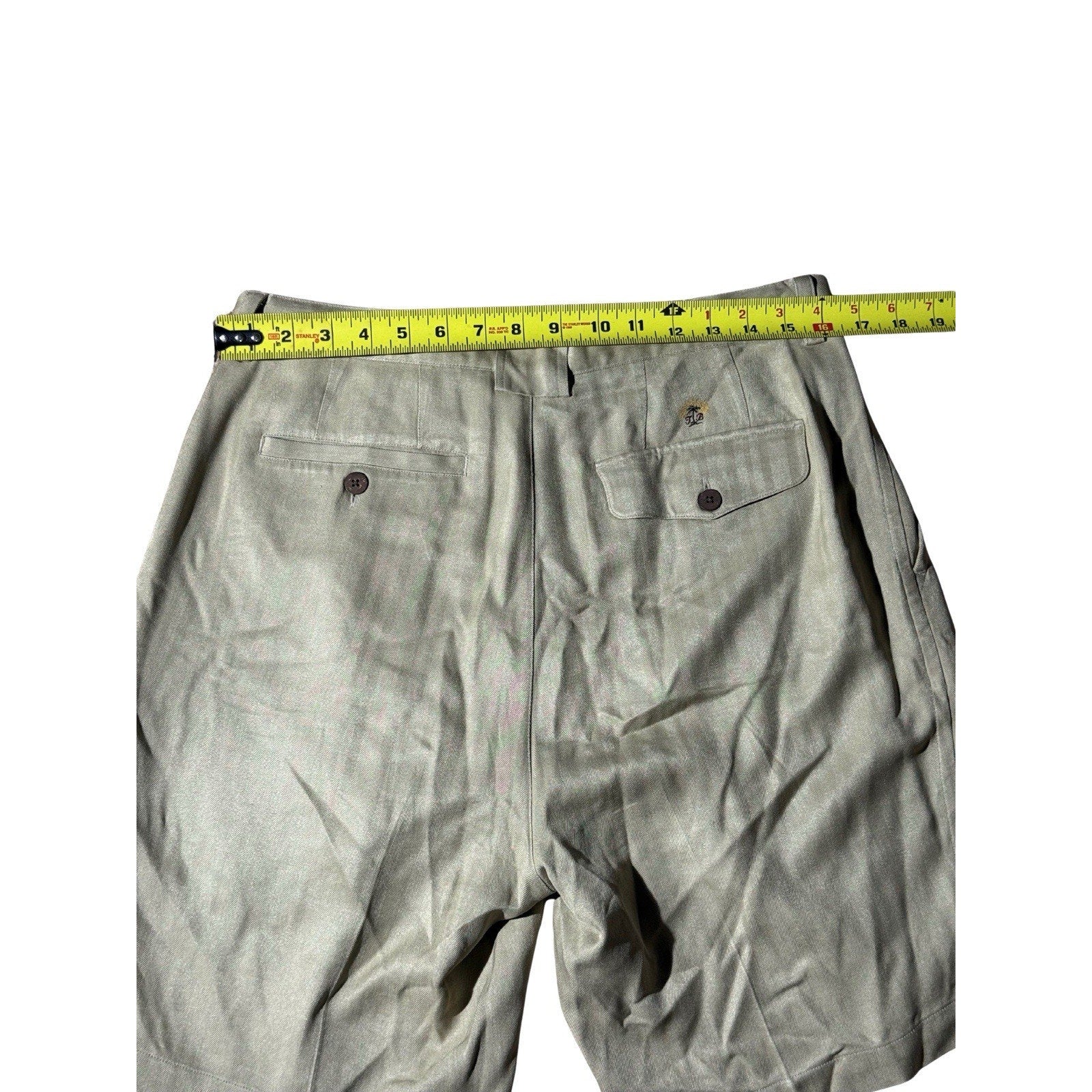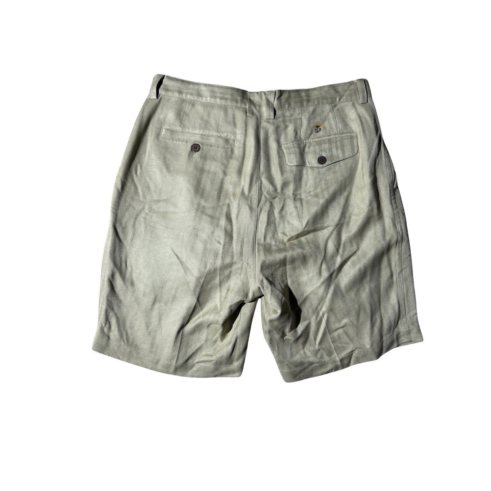 Tommy Bahama men’s silk shorts in a refined gray-green tone, tailored with a pleated front and classic island-inspired design. Crafted from 100% silk for a lightweight, smooth feel with a luxurious drape — perfect for warm-weather comfort and resort style. Features button and zip closure, belt loops, side pockets, and buttoned back pockets.