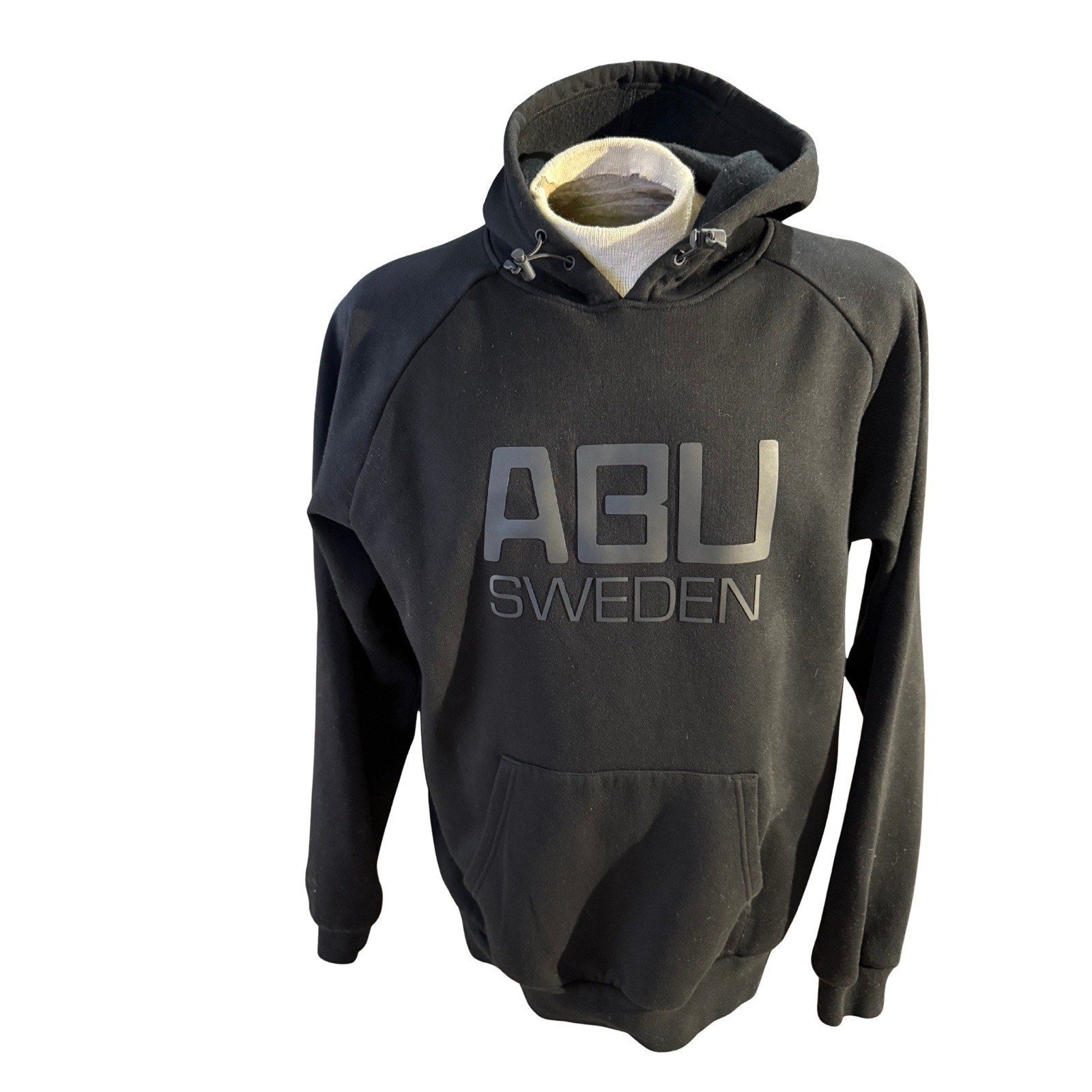 Abu Garcia ABU Sweden black hoodie with large tonal logo print. Classic pullover style with adjustable hood, kangaroo pocket, and soft fleece lining for comfort and warmth. Perfect for fishing, outdoor adventures, or casual wear.