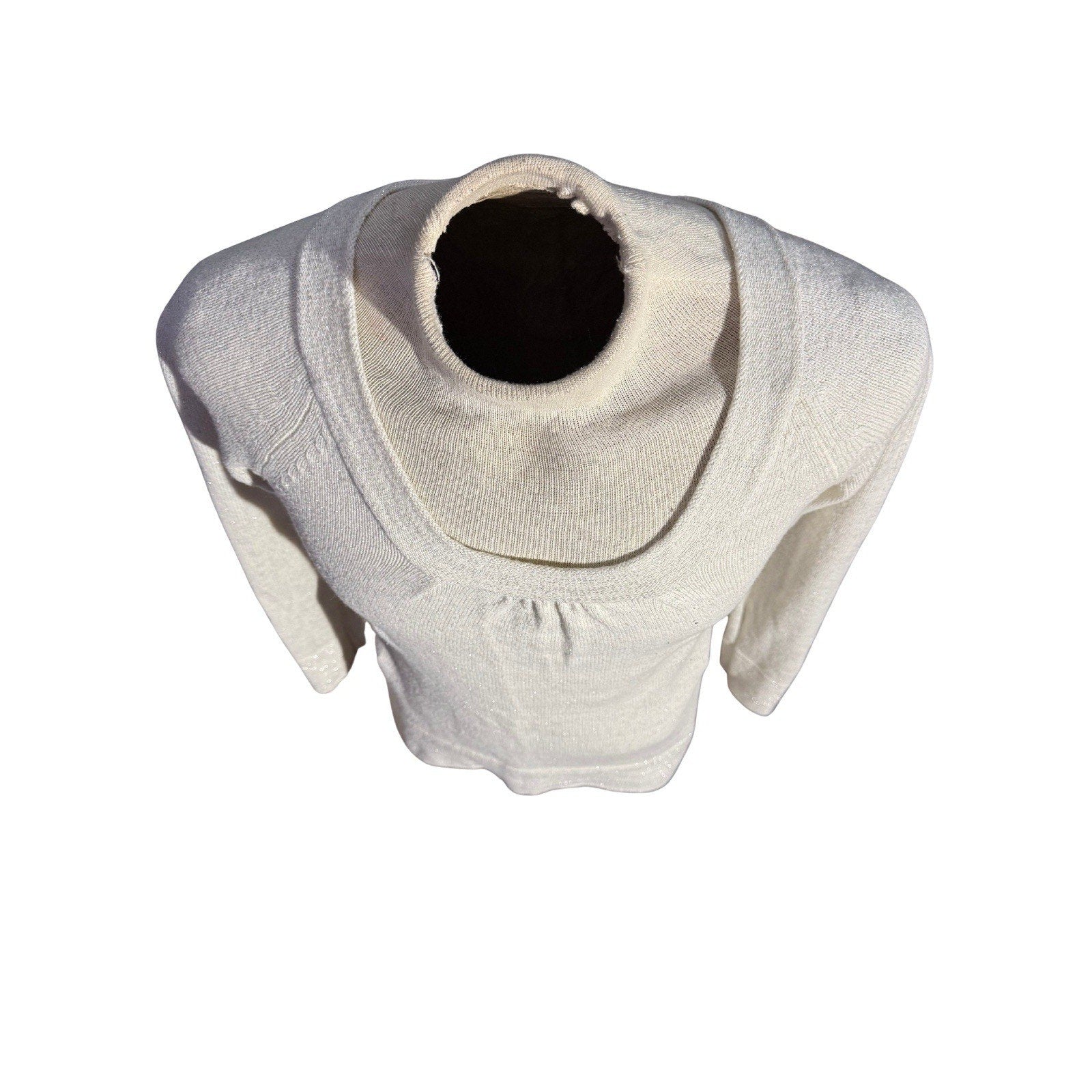 Elegant Banana Republic women’s sweater in a soft cream knit with subtle metallic threading for a refined shimmer. Features a scoop neckline with gentle front pleating, long sleeves, and a slim, flattering fit. Midweight wool-blend fabric provides warmth with a touch of sparkle — perfect for casual wear or layering for evening looks.
