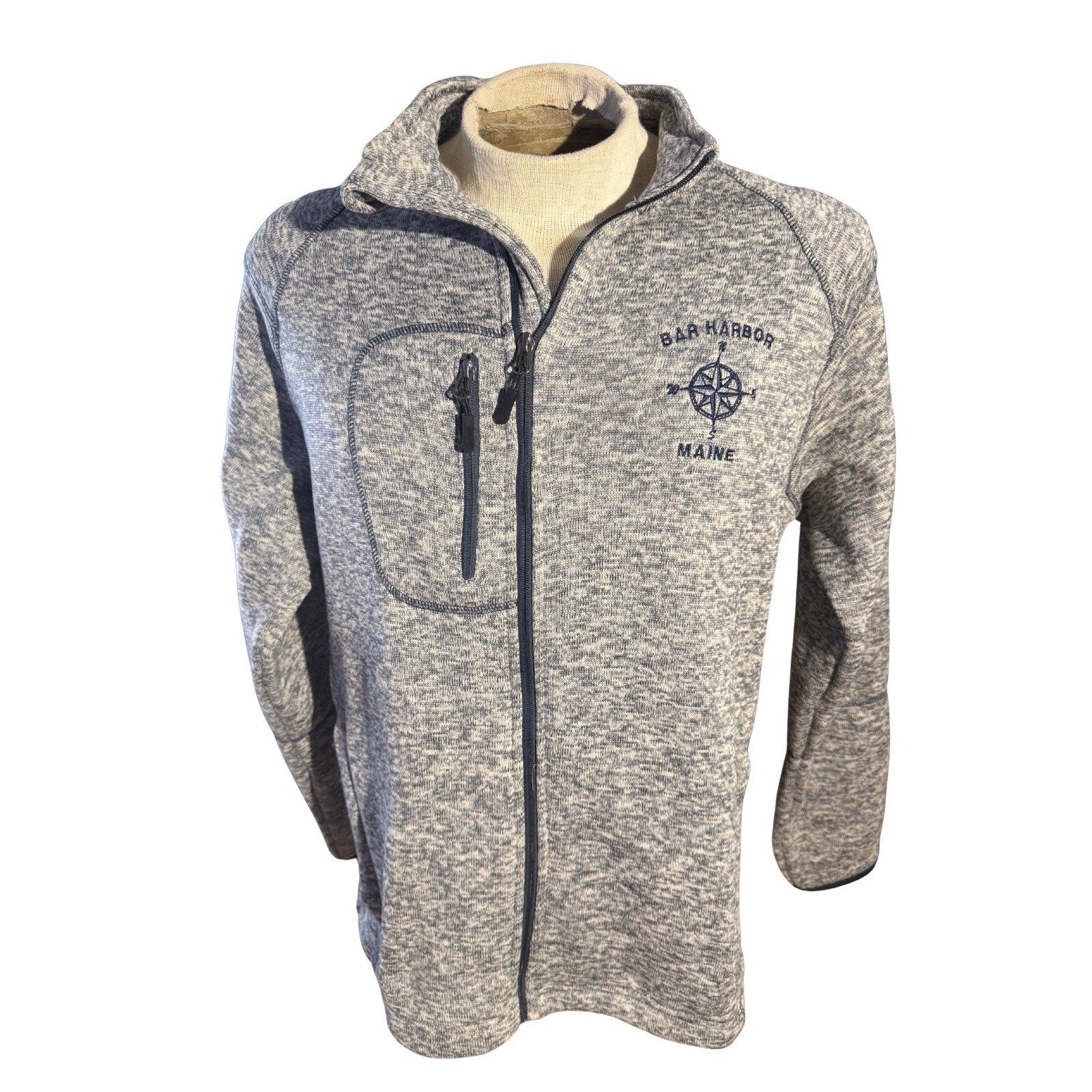 Bar Harbor, Maine full-zip fleece jacket by Dimco Apparel in men’s size Large. Features a soft gray heathered knit exterior with navy embroidered compass logo on the chest and navy zipper trim. Constructed from 100% polyester for warmth and comfort, with three zip pockets — one on the chest and two at the waist.