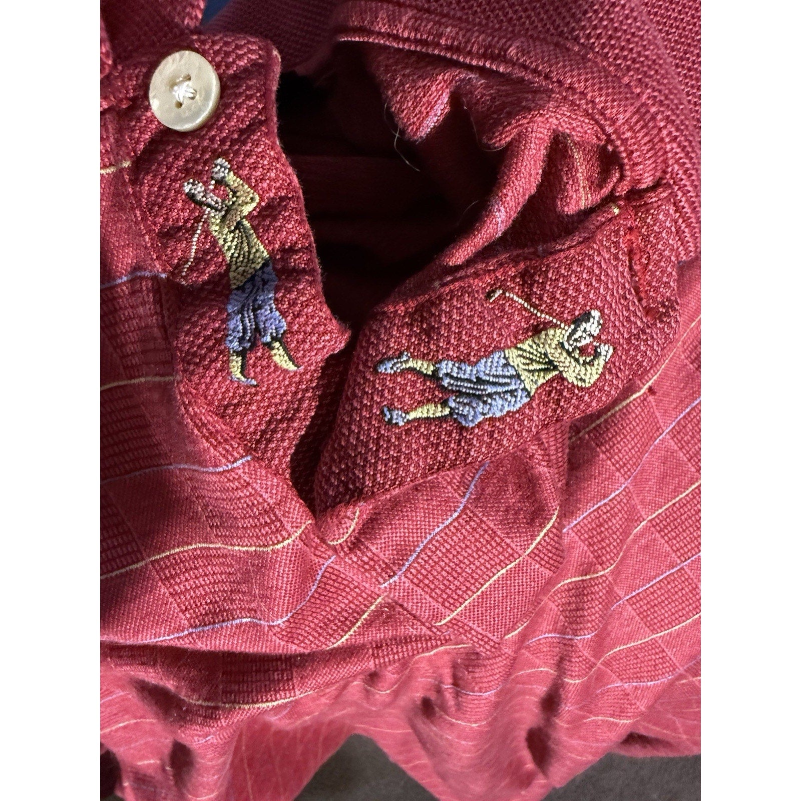 Bobby Jones Collection men’s XL golf polo shirt, made in Italy from 100% premium cotton. Features a red tonal grid pattern with subtle yellow accent lines and embroidered golfer graphics under the placket — a hallmark of Bobby Jones luxury golfwear. Soft, breathable knit fabric with classic fit and elegant craftsmanship throughout.