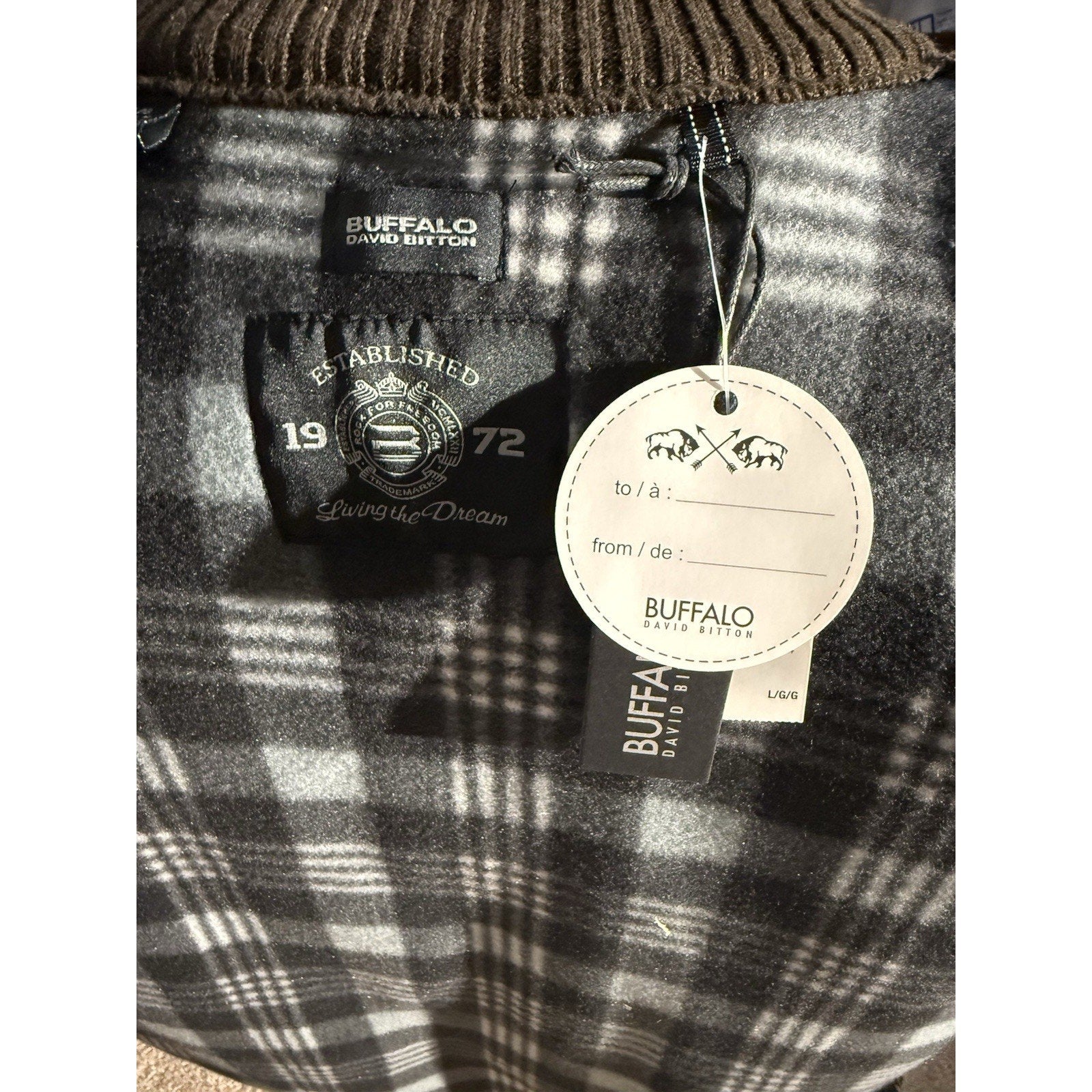 Stylish and rugged Buffalo David Bitton men’s full-zip sweater jacket in size Large. Features a heavy knit body with contrasting faux suede chest panels for a modern, outdoors-inspired look. Fully lined with soft plaid fleece interior for added warmth and comfort. Ribbed collar, cuffs, and hem provide a secure fit. Made of 100% polyester. Color: brown and gray mix with brown faux suede. Perfect for cool weather layering or casual nights out.