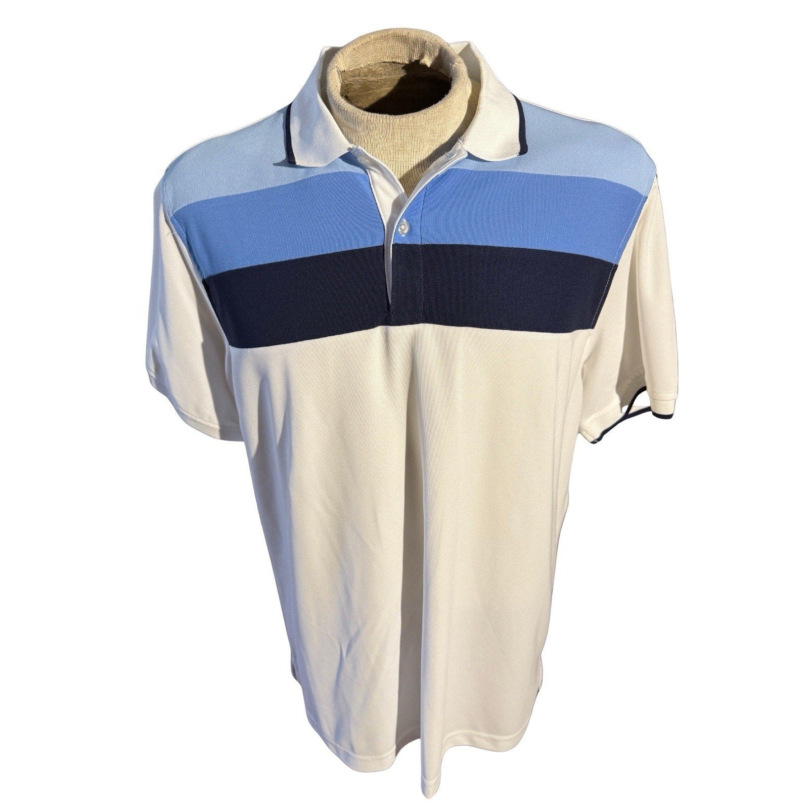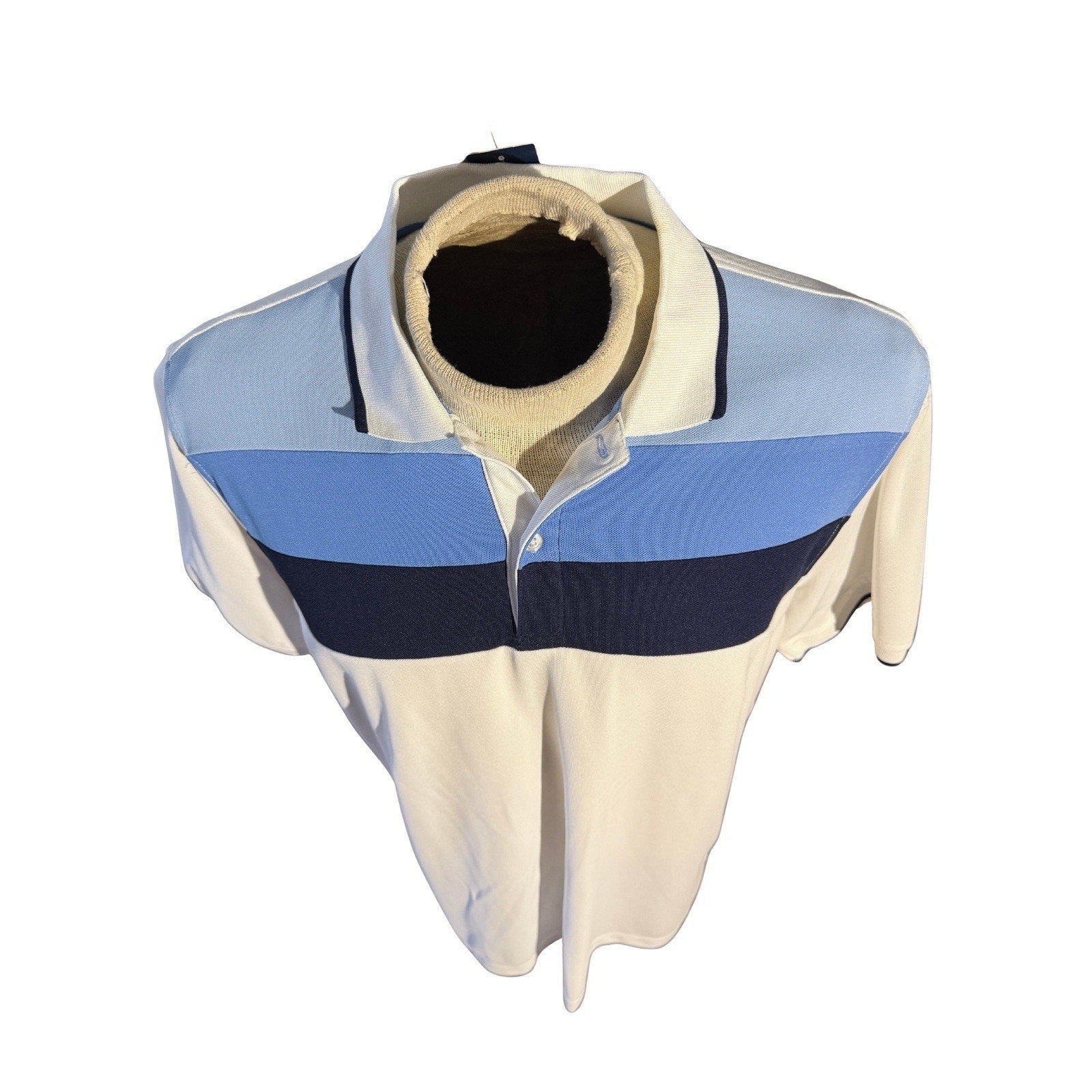New with tags — Club Room Performance men’s polo shirt featuring a clean colorblock design in cream white with sky blue and navy panels. Crafted from lightweight, breathable polyester designed to wick moisture and keep you cool and comfortable on the course or around town.