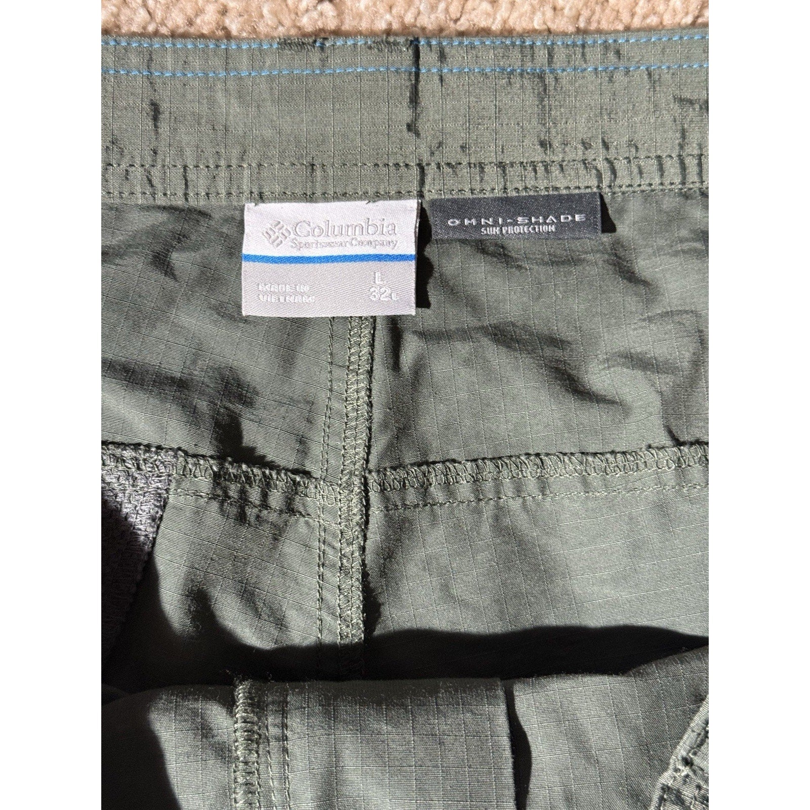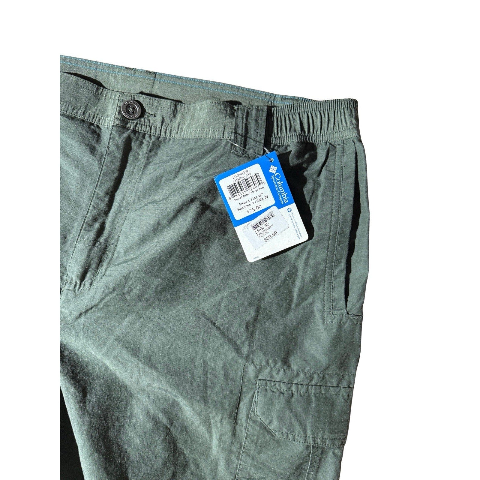 Brand new with tags Columbia Sportswear men’s Omni-Shade cargo pants, size Large / 32L. Lightweight ripstop nylon blend with built-in UPF sun protection. Features include elastic waist panels for comfort, cargo and back pockets, and straight-leg active fit. Perfect for hiking, fishing, or travel. Color: dark sage green. MSRP $75.00 — versatile outdoor wear built for comfort and durability.