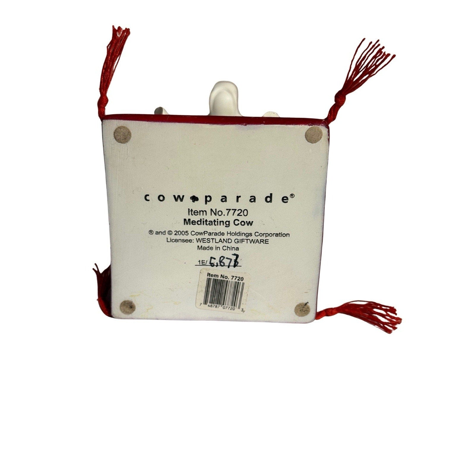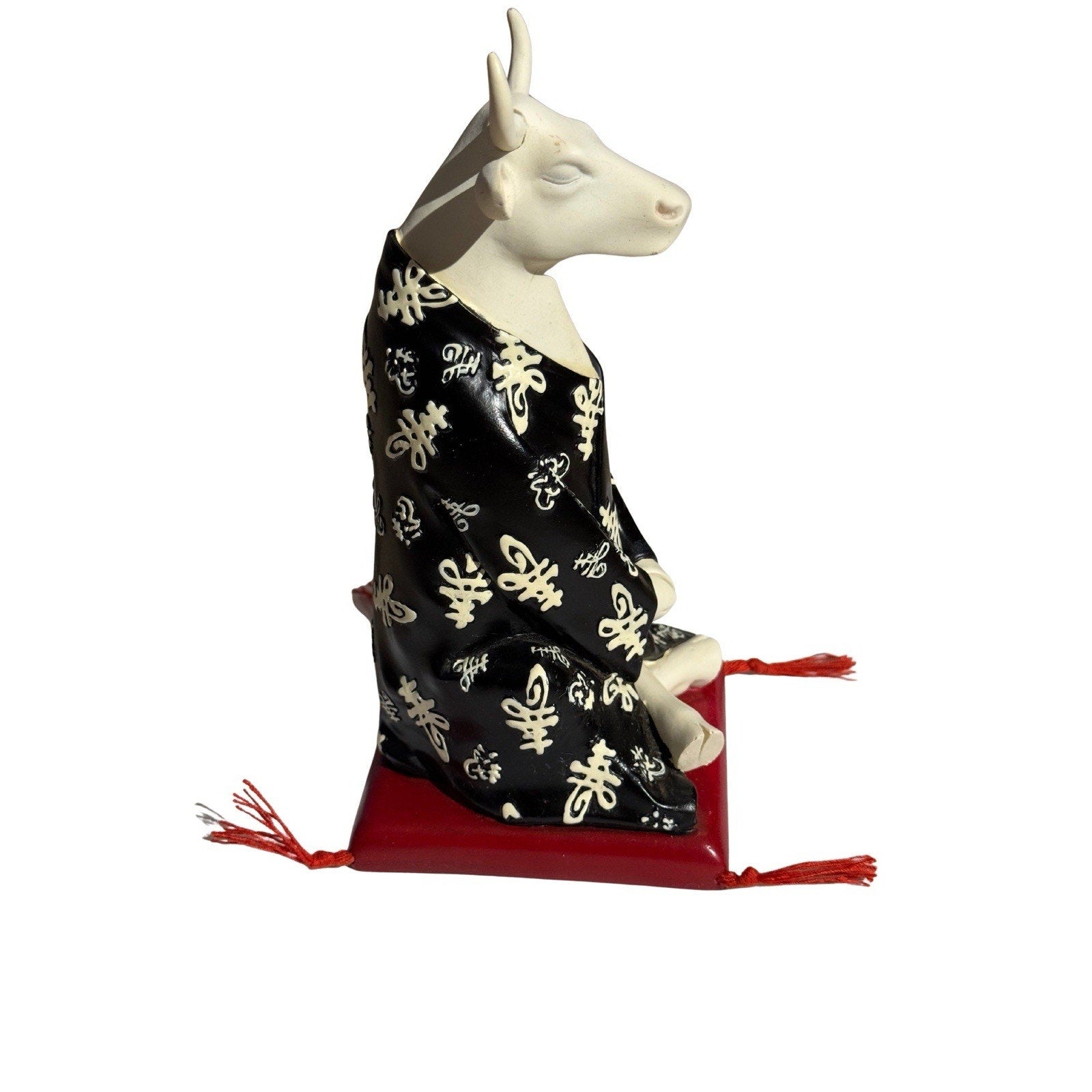 CowParade collectible figurine titled “Meditating Cow” (Item #7720). Released in 2005 by Westland Giftware. Features a serene white cow sitting cross-legged on a red tasseled cushion, draped in a black robe decorated with gold and white calligraphy-style script.