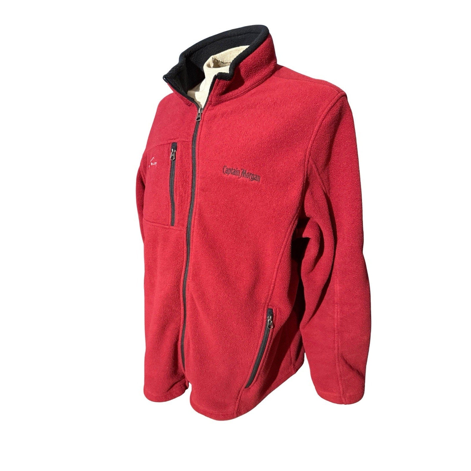 Rare Eddie Bauer fleece jacket with Captain Morgan embroidered logo. Promotional piece, not sold in stores. Features full zip front, chest pocket, and two zip hand pockets. Soft red fleece with black trim.