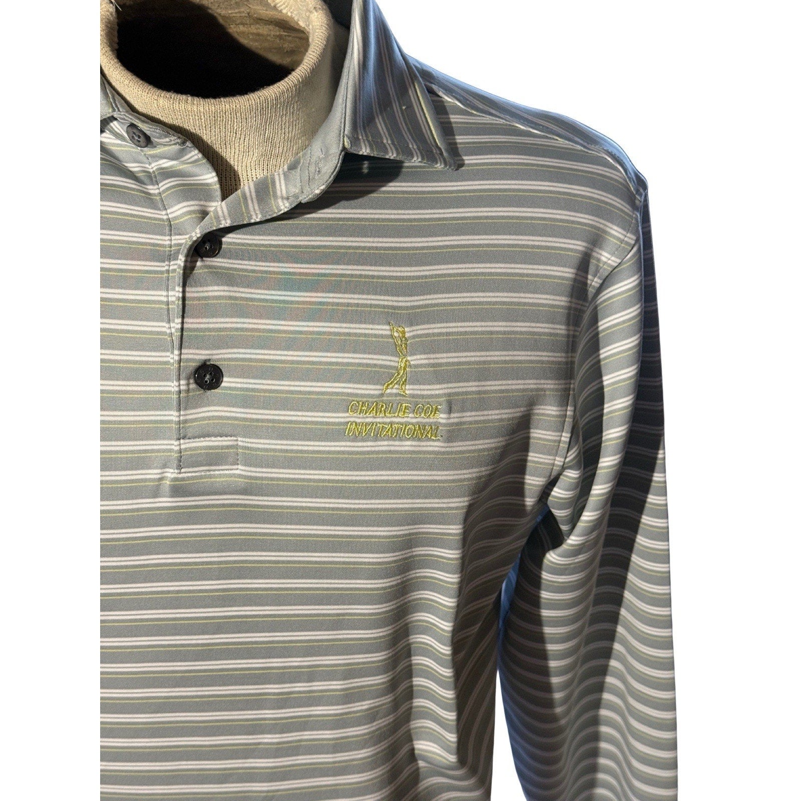 Classic FootJoy men’s performance polo, size Small. Long-sleeve striped design in gray with subtle white and light yellow pinstripes. Left chest features embroidered “Charlie Coe Invitational” golfer logo and text.