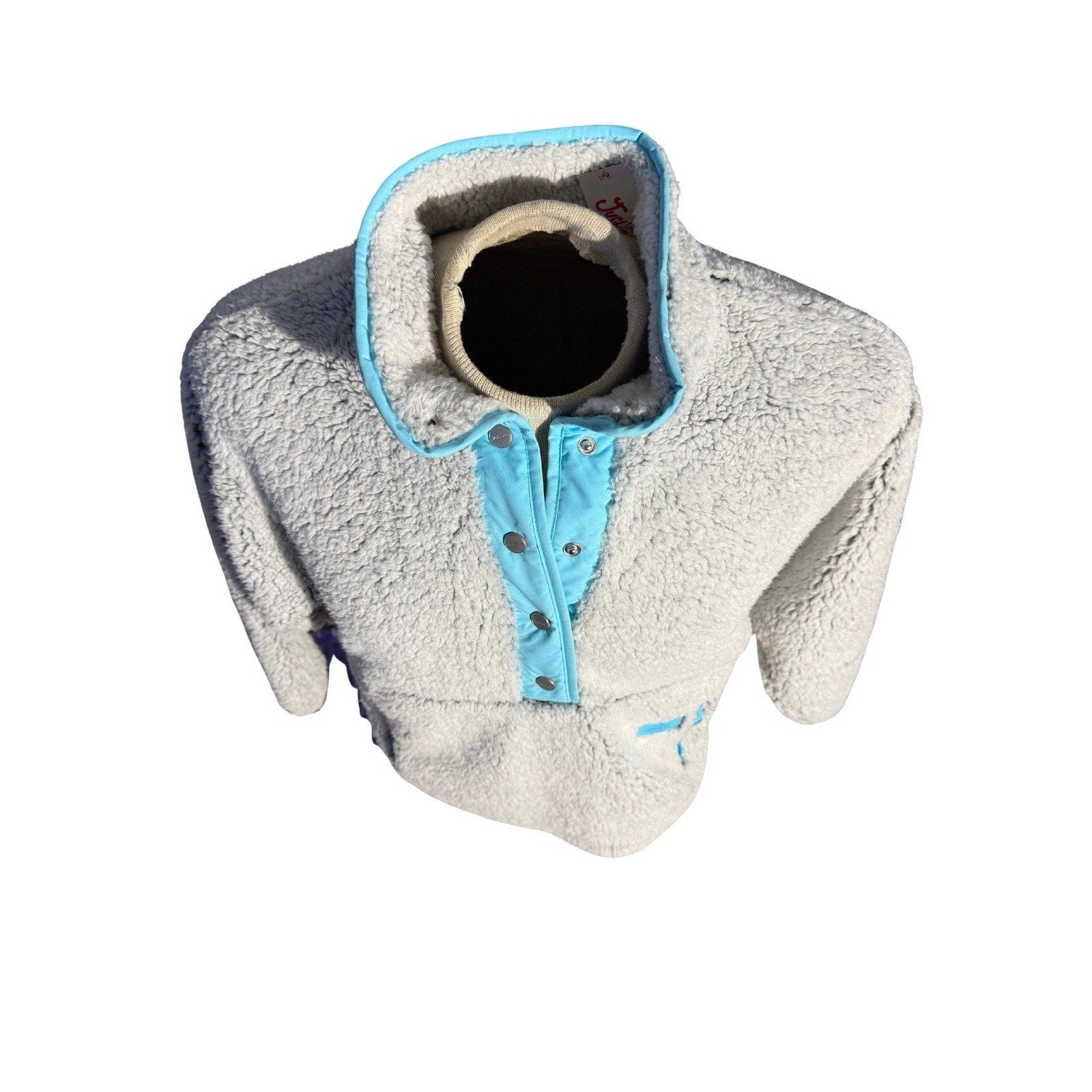 Stay warm and stylish with this Justice Sherpa pullover fleece in light gray with bright blue snap trim. Features a soft, plush sherpa exterior, front kangaroo pocket, and snap-front closure with silver hardware. Inside tag reads “Be Kind Stay Cozy.”