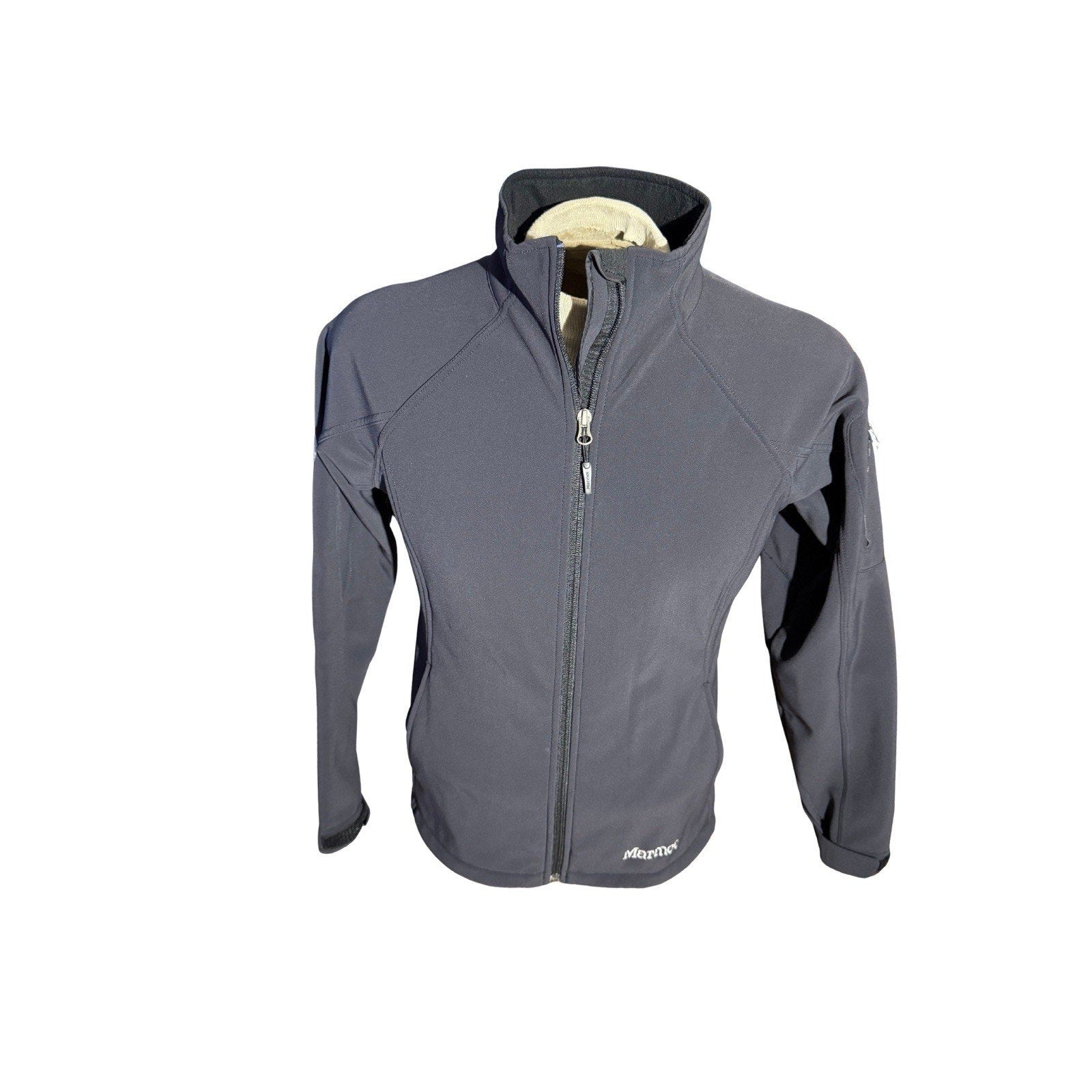 Marmot men’s size Medium softshell jacket in black. Features a durable nylon/elastane shell with polyester lining, designed for comfort and performance. Ideal for hiking, camping, and outdoor activities where wind resistance and flexibility are key.