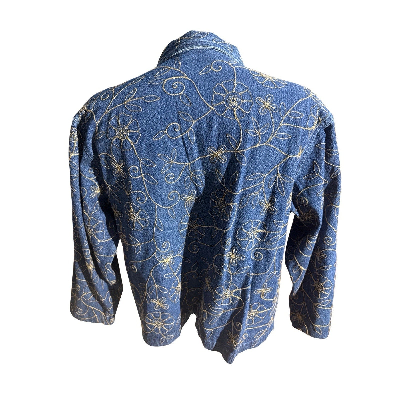Stylish women’s denim shirt jacket by New Directions, size XL. Made from 100% cotton with a soft, medium-weight feel, this versatile top features intricate gold floral embroidery throughout, giving it a beautifully textured, artisan look. Designed with a button front, classic collared neckline, and 3/4-length sleeves, perfect for layering across seasons.
