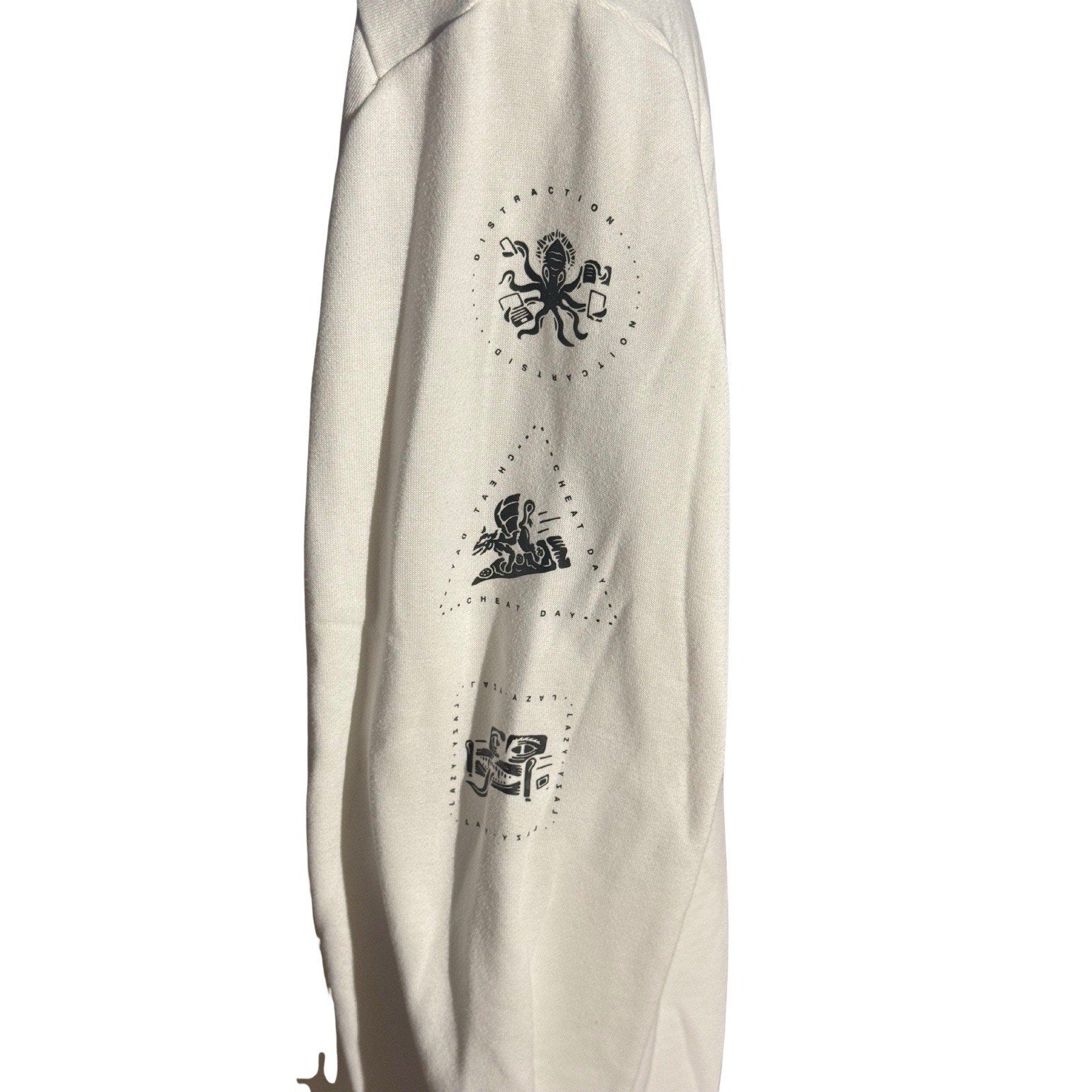 Stand out in this rare Nike Dri-Fit “Just Do It” graphic hoodie (style CK4591-100, SU20 collection). Crafted from a soft moisture-wicking cotton-poly blend, it features a Summit White body with contrast black hood, bright Volt drawstrings, and full zip front. Minimalist “JUST DO IT.” text across the chest balances striking sleeve artwork that captures Nike’s burnout-era capsule—tired eye, alarm clock, and octopus multitasker graphics representing focus vs distraction. A hand-drawn double-stroke Swoosh decorates the back for an exclusive finish. Lightweight, breathable, and hard to find, this limited-release hoodie was produced for one season only. Perfect for collectors of Nike Sportswear, streetwear enthusiasts, and anyone chasing unique archive pieces. Size XL, excellent condition with minor wear—see photos.