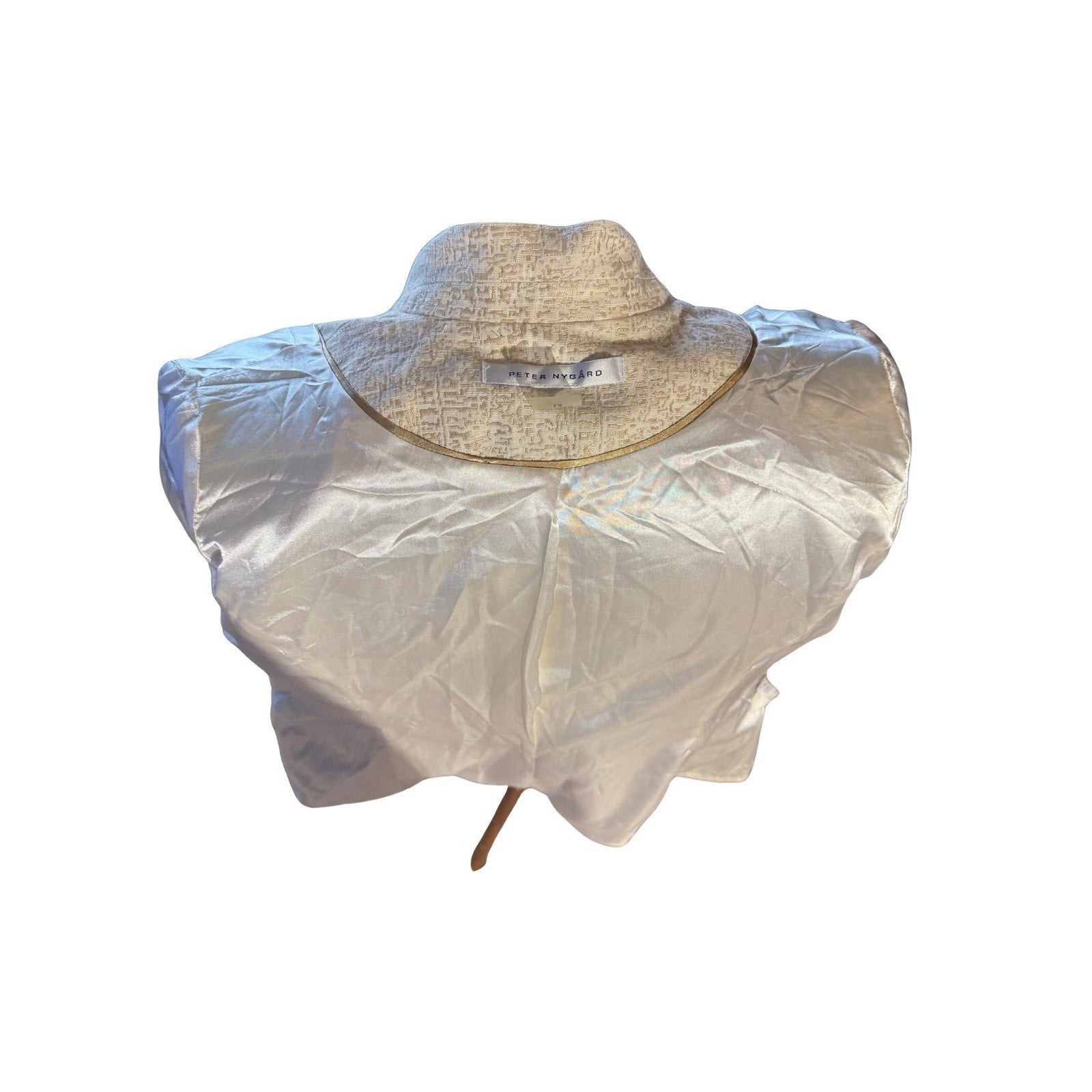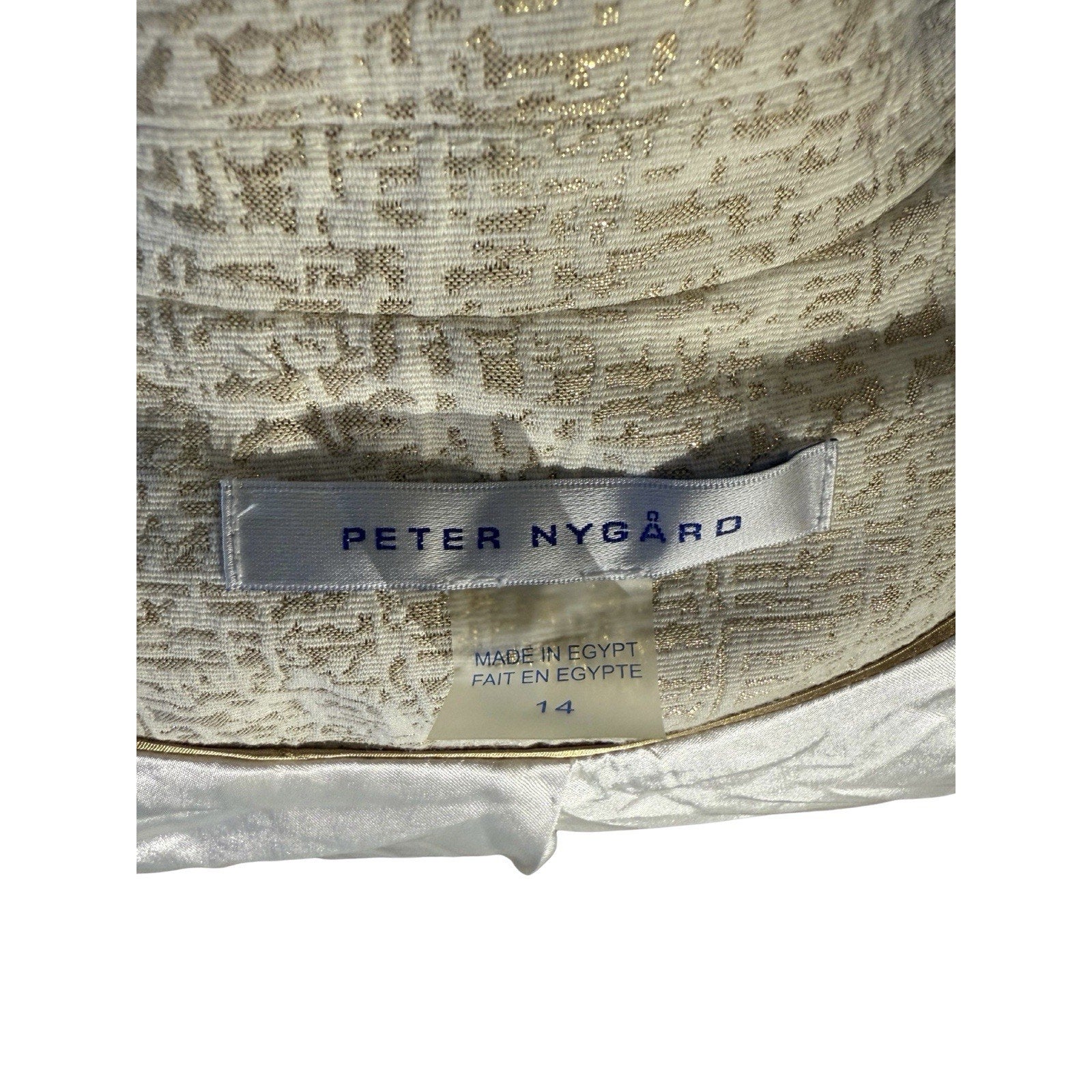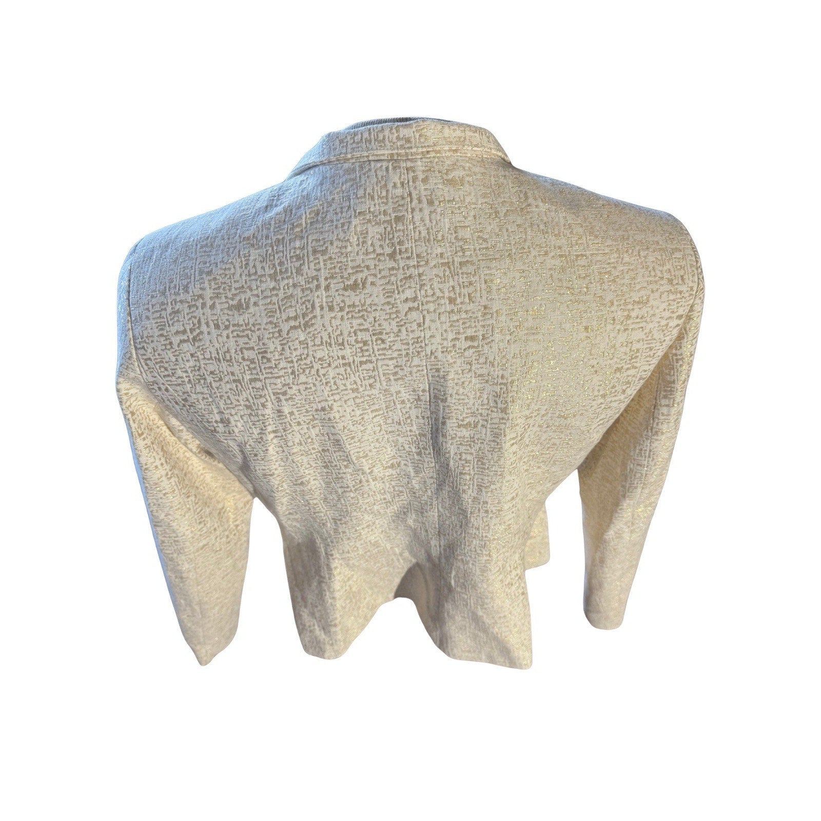 Elegant vintage Peter Nygard women’s blazer, size 14. Tailored single-button jacket in cream with metallic gold jacquard woven pattern. Features structured shoulders, notched lapel, front button closure, and zip detail pocket. Fabric blend: 55% cotton, 34% rayon, 11% metallic fiber. Made in Egypt. Fully lined. Timeless evening or cocktail piece with subtle shimmer.