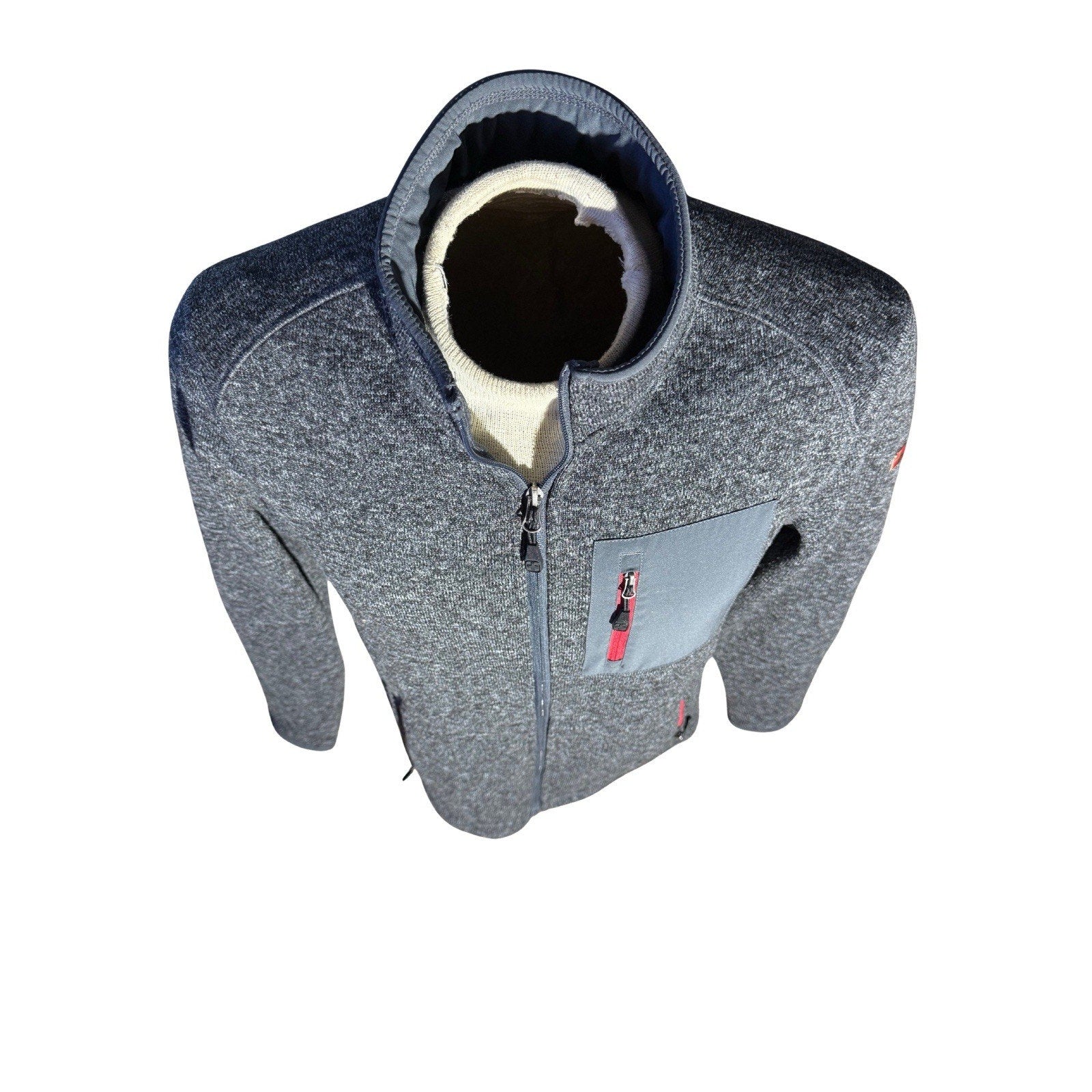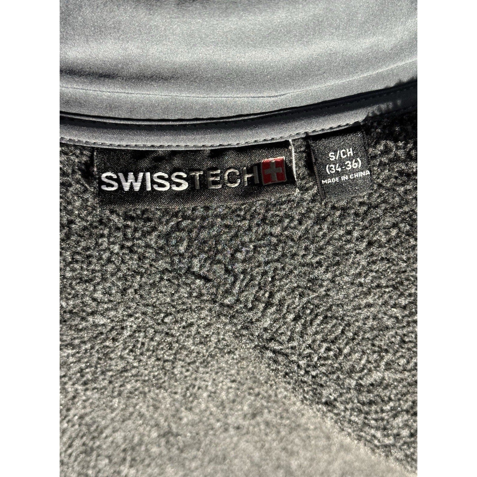 SwissTech men’s full-zip fleece jacket in charcoal gray heather with red zipper trim and contrast chest pocket. Size Small (34–36). Soft 100% polyester knit fleece with a warm brushed interior and stand collar. Features zip chest and hand pockets, durable construction, and the signature Swiss cross logo on the sleeve. Excellent condition — clean with no visible flaws.