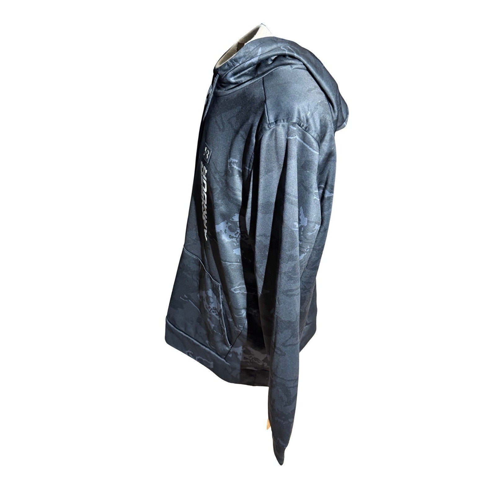 Pre-owned in excellent condition! This Under Armour pullover hoodie features a sleek gray/black camo design with bold vertical Under Armour logo graphic. Made with lightweight performance fabric, perfect for workouts, casual wear, or layering.