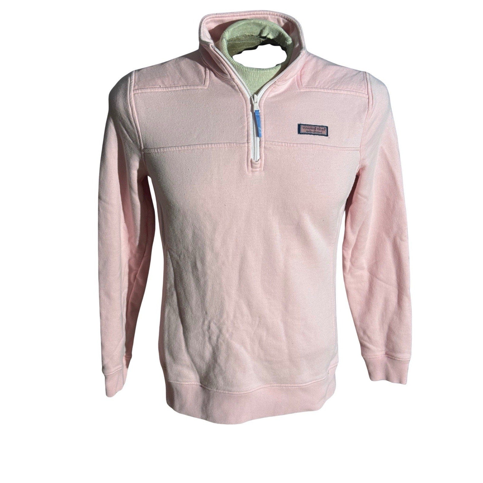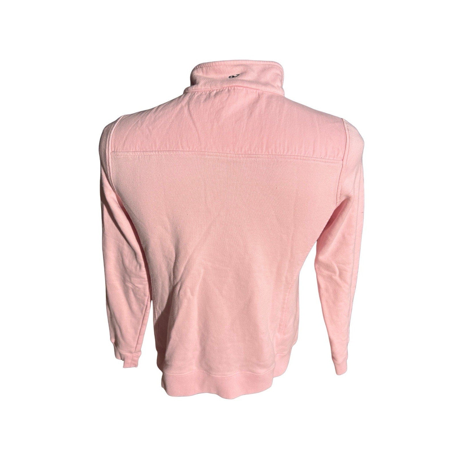 Authentic Vineyard Vines women’s Shep Shirt pullover in soft light pink. Features the signature quarter-zip front, stand collar, and embroidered whale logo on back neck. Classic Vineyard Vines patch on chest with sturdy cotton blend fabric — midweight, warm, and built for casual coastal comfort.