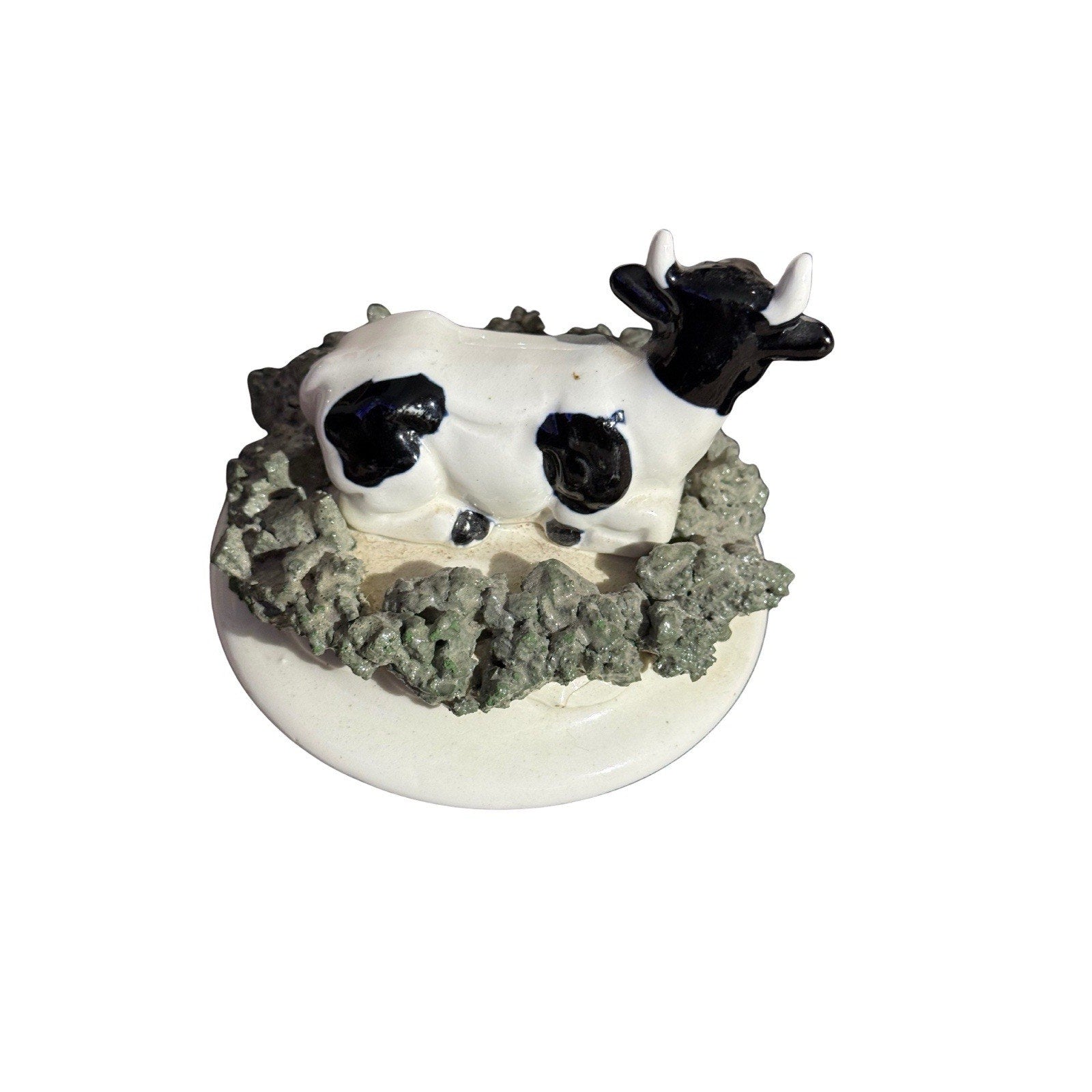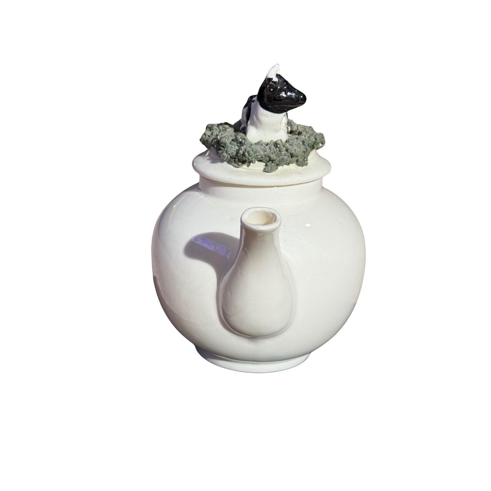 • Design: Round white teapot with lid featuring a black & white cow reclining in green foliage
