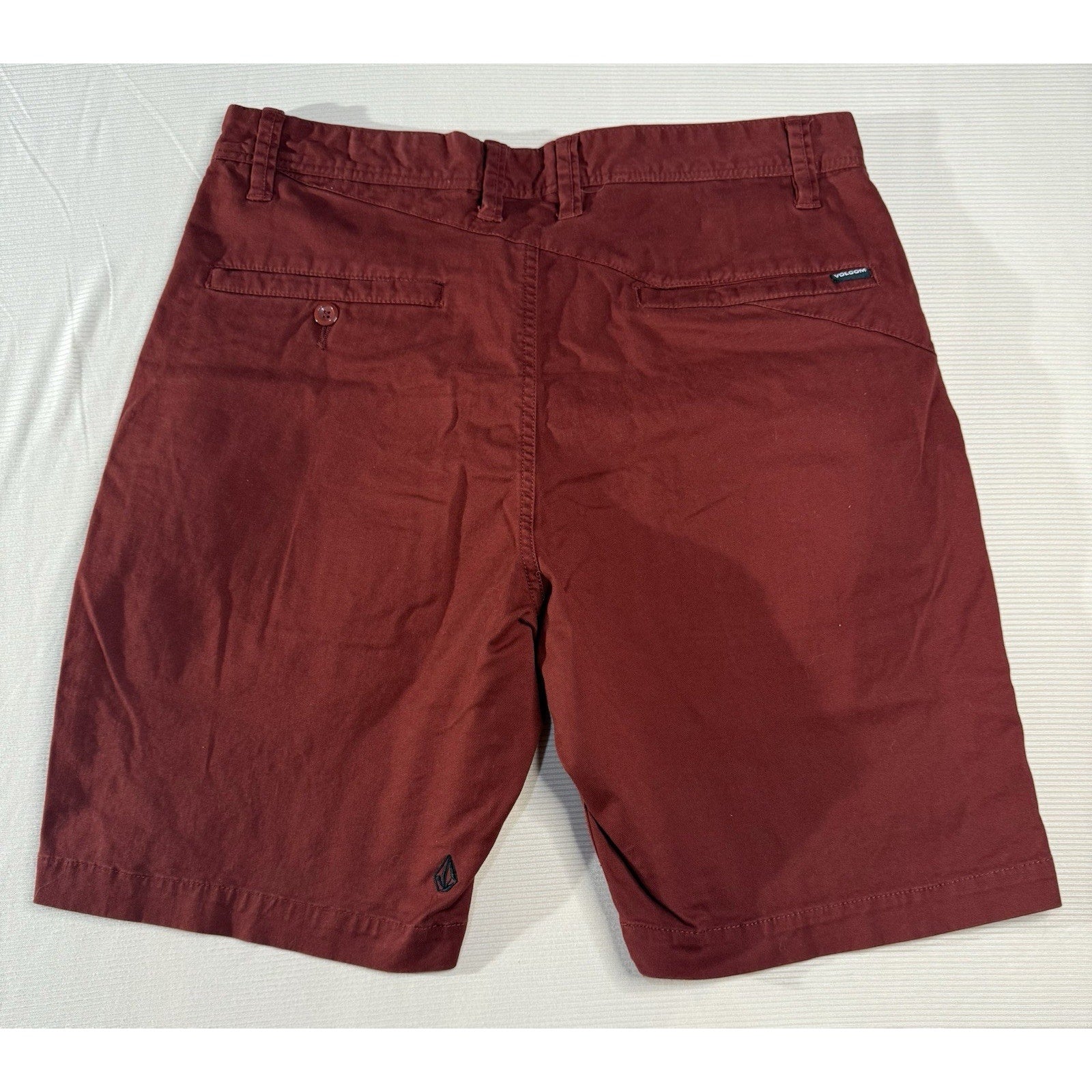 Classic Volcom men’s chino shorts in a rich brick red color. Size 33. Made from 98% cotton and 2% elastane for comfortable stretch and movement. Features side hand pockets, back welt pockets (one buttoned, one with Volcom logo tag), belt loops, and zip fly with button closure. Great for casual wear, skate, surf, or summer outings.